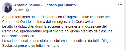 Lo apprendiamo dalla pagina Facebook di Antonio Sabino, Sindaco di Quarto: