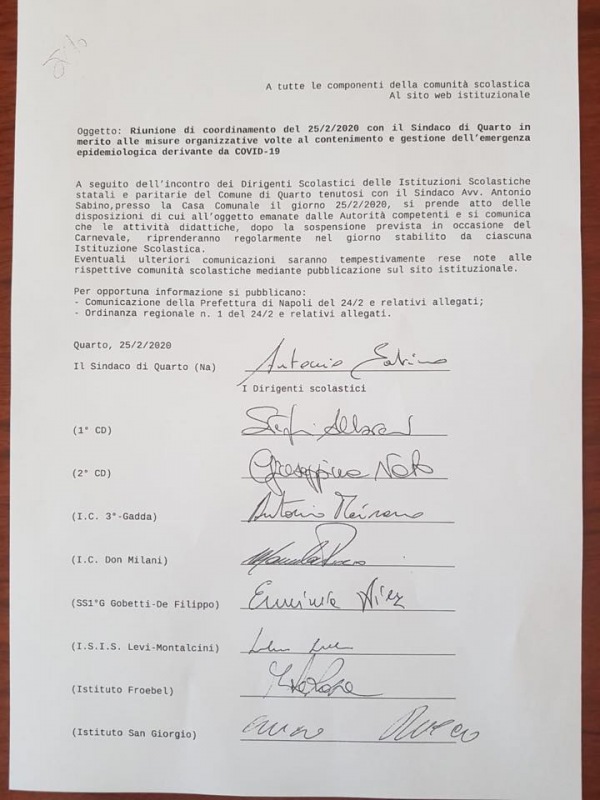 "Appena terminato anche l’incontro con i Dirigenti di tutte le scuole del Comune di Quarto sul tema dell’emergenza da Coronavirus.