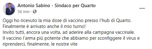 Questo il post pubblicato sulla sua Pagina Facebook dal Sindaco di Quarto Antonio Sabino: "Oggi ho ricevuto la mia dose di vaccino presso l’hub di Quarto. Finalmente è arrivato anche il mio turno! Invito tutti - si legge nel post - ancora una volta, ad aderire alla campagna vaccinale. Il vaccino l’arma più potente che abbiamo per sconfiggere il virus - conclude il post - e riprenderci, finalmente, le nostre vite".