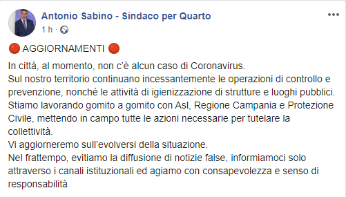 In città, al momento, non c’è alcun caso di Coronavirus. Sul nostro territorio continuano incessantemente le operazioni di controllo e prevenzione, nonché le attività di igienizzazione di strutture e luoghi pubblici. Stiamo lavorando gomito a gomito con Asl, Regione Campania e Protezione Civile, mettendo in campo tutte le azioni necessarie per tutelare la collettività. Vi aggiorneremo sull’evolversi della situazione. Nel frattempo, evitiamo la diffusione di notizie false, informiamoci solo attraverso i canali istituzionali ed agiamo con consapevolezza e senso di responsabilità".