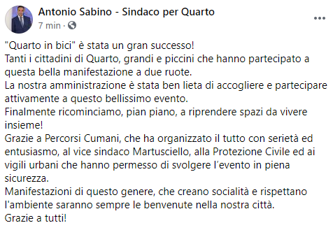 Questo il post pubblicato sulla sua pagina Facebook dal Sindaco di Quarto Antonio Sabino: ""Quarto in bici" è stata un gran successo!