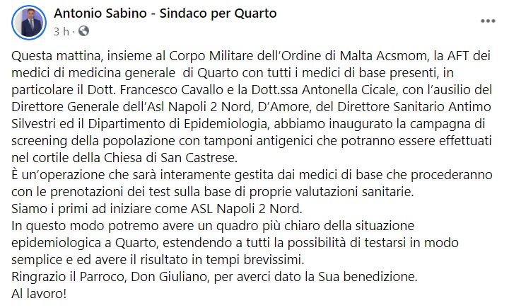 Questo quanto apprendiamo dalla pagina facebook del Sindaco Sabino:
