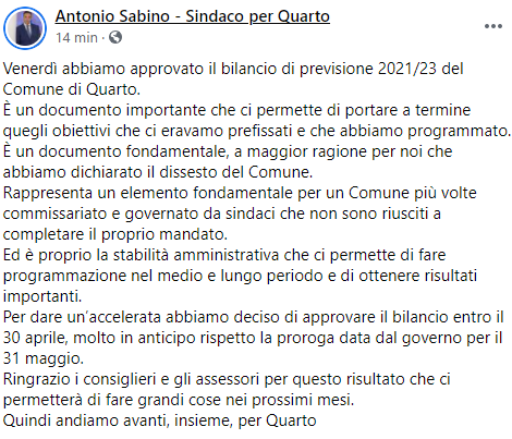 Questo il post pubblicato dal Sindaco di Quarto Antonio Sabino sulla sua pagina Facebook: "Venerdì abbiamo approvato il bilancio di previsione 2021/23 del Comune di Quarto. È un documento importante che ci permette di portare a termine quegli obiettivi che ci eravamo prefissati e che abbiamo programmato. È un documento fondamentale - si legge nel post - a maggior ragione per noi che abbiamo dichiarato il dissesto del Comune. Rappresenta un elemento fondamentale per un Comune più volte commissariato e governato da sindaci che non sono riusciti a completare il proprio mandato. Ed è proprio la stabilità amministrativa che ci permette di fare programmazione nel medio e lungo periodo e di ottenere risultati importanti. Per dare un’accelerata - prosegue il post - abbiamo deciso di approvare il bilancio entro il 30 aprile, molto in anticipo rispetto la proroga data dal governo per il 31 maggio. Ringrazio i consiglieri e gli assessori per questo risultato che ci permetterà di fare grandi cose nei prossimi mesi. Quindi andiamo avanti - conclude il post - insieme, per Quarto".