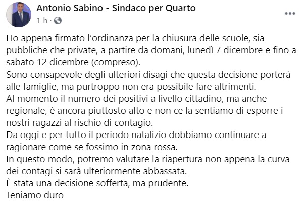 Questo quanto apprendiamo dalla pagina facebook del Sindaco Sabino: