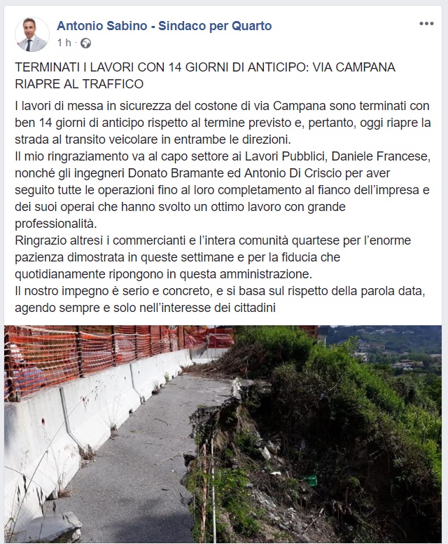 Questo quanto apprendiamo dal Sindaco di Quarto Antonio Sabino