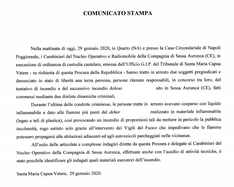 Questo parte del comunicato della Procura della Repubblica presso il Tribunale di SMCV: