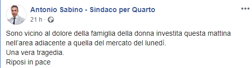 "Sono vicino al dolore della famiglia della donna investita questa mattina nell’area adiacente a quella del mercato del lunedì.