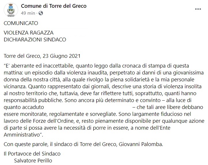 Questo quanto apprendiamo dalla pagina facebook del Comune di Torre del Greco: "VIOLENZA RAGAZZA ... – DICHIARAZIONI SINDACO Torre del Greco, 23 Giugno 2021 “E’ aberrante ed inaccettabile, quanto leggo dalla cronaca di stampa di questa mattina: un episodio dalla violenza inaudita, perpetrato ai danni di una giovanissima donna della nostra città - si legge nella nota -, alla quale rivolgo la piena solidarietà e la mia personale vicinanza. Quanto rappresentato dai giornali, descrive una storia di violenza insolita al nostro territorio che, tuttavia, deve far riflettere tutti, soprattutto, quanti hanno responsabilità pubbliche. Sono ancora più determinato e convinto – alla luce di quanto accaduto ... – che tali aree libere debbano essere monitorate, regolamentate e sorvegliate. Sono largamente fiducioso nel lavoro delle Forze dell’Ordine - si legge nella nota -, e, resto pienamente disponibile per qualunque azione di parte si possa avere la necessità di porre in essere, a nome dell’Ente Amministrativo”. Con queste parole, il sindaco di Torre del Greco, Giovanni Palomba. Il Portavoce del Sindaco Salvatore Perillo"
