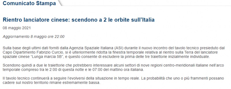Questa la nota stampa di poco fa del Dipartimento di Protezione Civile: "Aggiornamento 8 maggio ore 22:00. Sulla base degli ultimi dati forniti dalla Agenzia Spaziale Italiana (ASI) durante il nuovo incontro del tavolo tecnico presieduto dal Capo Dipartimento Fabrizio Curcio - si legge nel comunicato - si è ulteriormente ridotta la finestra temporale relativa al rientro sulla Terra del lanciatore spaziale cinese “Lunga marcia 5B”, e questo consente di escludere la prima delle tre traiettorie inizialmente individuate. Scendono quindi a due le traiettorie che potrebbero interessare alcuni settori di nove regioni centro-meridionali italiane nell’arco temporale compreso tra le 2:00 di questa notte e le 07:00 del mattino ora italiana. Il tavolo tecnico continuerà a seguire l’evolversi della situazione - prosegue la nota - in tempo reale. La probabilità che uno o più frammenti possano cadere sul nostro territorio rimane estremamente bassa".