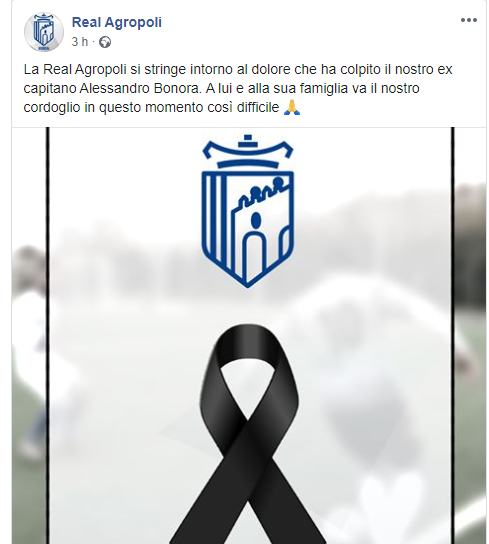 "La Real Agropoli si stringe intorno al dolore che ha colpito il nostro ex capitano Alessandro Bonora. A lui e alla sua famiglia va il nostro cordoglio in questo momento così difficile".