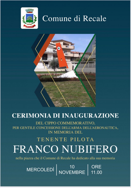 Mercoledì 10 novembre, alle ore 11:00 si terrà la cerimonia di inaugurazione del cippo commemorativo dedicato alla memoria del tenete pilota dell'arma dell'aereonautica Franco Nubifero, presso la piazza che il Comune di Recale ha dedicato alla sua memoria.