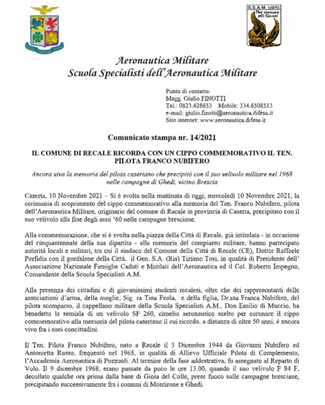 "IL COMUNE DI RECALE RICORDA CON UN CIPPO COMMEMORATIVO IL TEN. PILOTA FRANCO NUBIFERO. Ancora viva la memoria del pilota casertano che precipitò con il suo velivolo militare nel 1968 nelle campagne di Ghedi, vicino Brescia Caserta, 10 Novembre 2021 – Si è svolta nella mattinata di oggi, mercoledì 10 Novembre 2021, la cerimonia di scoprimento del cippo commemorativo alla memoria del Ten. Franco Nubifero, pilota dell’Aeronautica Militare, originario- si legge nella nota- del comune di Racale in provincia di Caserta, precipitato con il suo velivolo alla fine degli anni ’60 nelle campagne bresciane. Alla commemorazione, che si è svolta nella piazza della Città di Recale, già intitolata - in occasione del cinquantennale della sua dipartita - alla memoria del compianto militare, hanno partecipato autorità locali e militari, tra cui il sindaco del Comune della Città di Recale (CE), Dottor Raffaele Porfidia con il gonfalone della Città, il Gen. S.A. (Ris) Tiziano Tosi, in qualità di Presidente dell’ Associazione Nazionale Famiglie Caduti e Mutilati dell’Aeronautica ed il Col. Roberto Impegno, Comandante della Scuola Specialisti A.M. Alla presenza dei cittadini e di giovanissimi studenti recalesi, oltre che dei rappresentanti delle associazioni d’arma, della moglie, Sig. ra Tina Feola, e della figlia, Dr.ssa Franca Nubifero, del pilota scomparso, il cappellano militare della Scuola Specialisti A.M., Don Emilio di Muccio, ha benedetto la semiala di un velivolo SF 260, cimelio aeronautico scelto per coronare il cippo commemorativo alla memoria del pilota casertano il cui ricordo, a distanza di oltre 50 anni, è ancora vivo fra i suoi concittadini. Il Ten. Pilota Franco Nubifero, nato a Recale il 3 Dicembre 1944 da Giovanni Nubifero ed Antonietta Russo, frequentò nel 1965, in qualità di Allievo Ufficiale Pilota di Complemento, l’Accademia Aeronautica di Pozzuoli. Al termine della fase addestrativa, fu assegnato al Reparto di Volo. Il 9 dicembre 1968, erano passate da poco le ore 13.00, quando il suo velivolo F 84 F, decollato qualche ora prima dalla base di Gioia del Colle, prese fuoco sulle campagne bresciane, precipitando successivamente fra i comuni di Montirone e Ghedi. La Scuola Specialisti, presente- si legge nella nota- con una rappresentanza alla manifestazione, è un Istituto militare di istruzione per le attività di formazione basica iniziale, formazione tecnica specialistica, addestramento, aggiornamento, specializzazione, qualificazione e riconversione del personale dell’Aeronautica Militare, delle Altre Forze Armate, Corpi Armati e non dello Stato, nonché di personale di Forze Armate estere. Dipende dal Comando delle Scuole/3^ Regione Aerea con sede a Bari."
