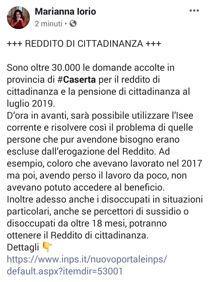Reddito di cittadinanza. L'On. Iorio: "Da oggi sarà possibile...". I dettagli