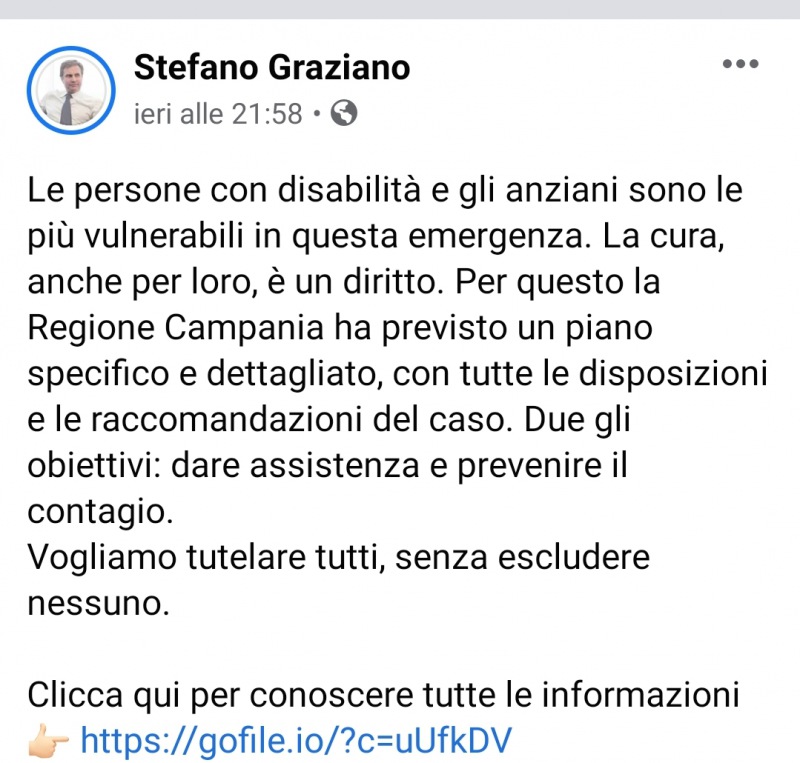 "Le persone con disabilità e gli anziani sono le più vulnerabili in questa emergenza. La cura, anche per loro, è un diritto. Per questo la Regione Campania ha previsto un piano specifico e dettagliato, con tutte le disposizioni e le raccomandazioni del caso. Due gli obiettivi: dare assistenza e prevenire il contagio.