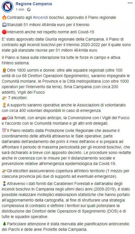 Questo quanto apprendiamo dalla pagina facebook della Regione Campania: