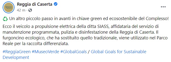 "Un altro piccolo passo in avanti in chiave green ed ecosostenibile del Complesso! Ecco il veicolo a propulsione elettrica della ditta SIASS, affidataria del servizio di manutenzione programmata, pulizia e disinfestazione della Reggia di Caserta. Il furgoncino ecologico, che ha sostituito- si legge nella nota- quello tradizionale, viene utilizzato nel Parco Reale per la raccolta differenziata."