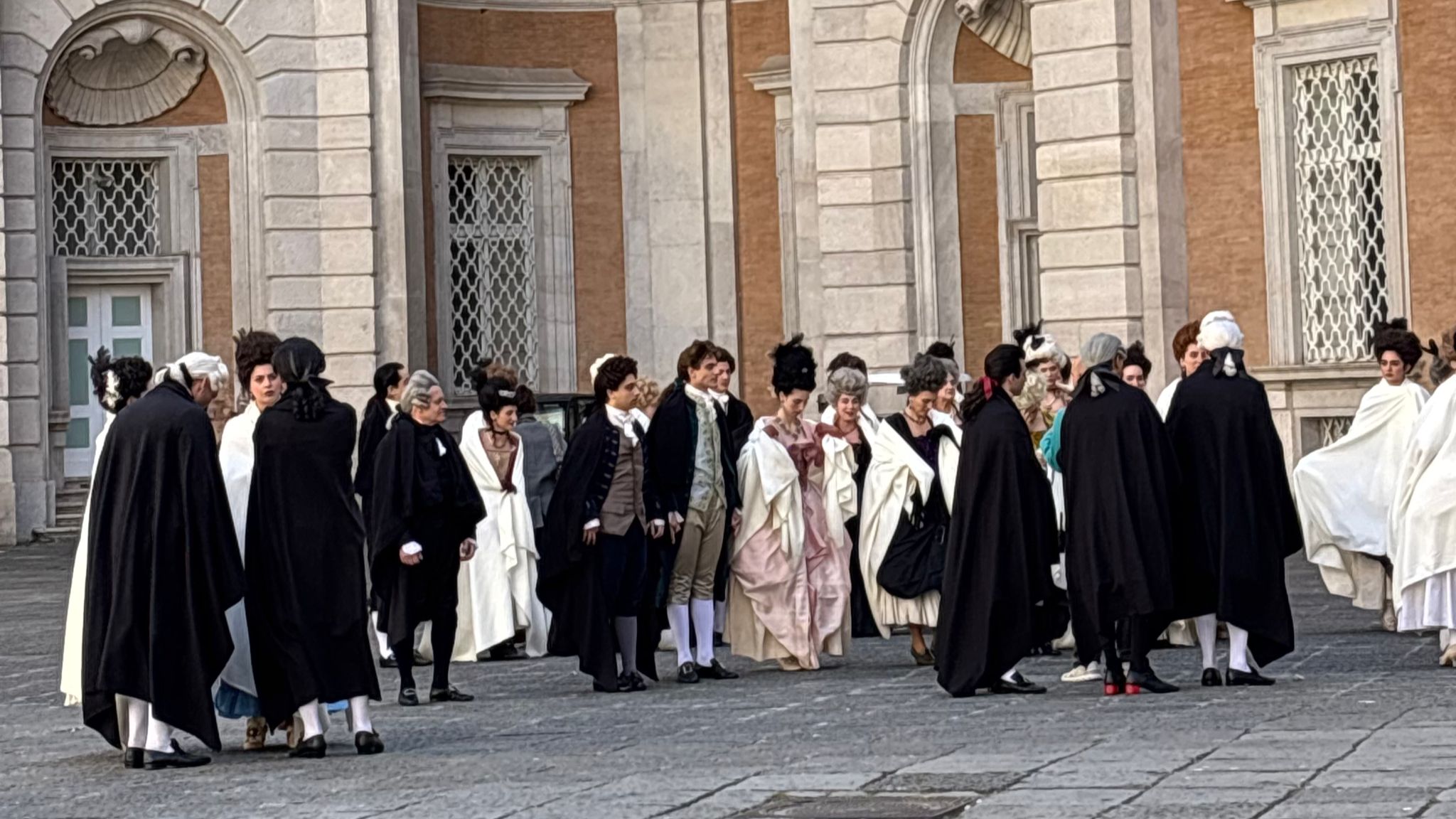 Abiti da pieno rinascimento in perfetto pendant con la location. I visitatori della Reggia di Caserta, oggi, hanno potuto approfittare di un piacevole fuori programma. In corso, nei cortili del monumento vanvitelliano, le riprese del film 'Cry to heaven' di Tom Ford. Tra gli attori del cast anche Colin Firth e Adele. I protagonisti sono in costume d'epoca, come si vede dalla foto, a perfetto agio nella splendida cornice della splendida Reggia casertana. Le riprese sono in corso già da qualche giorno.