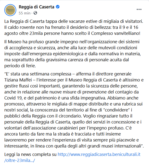 Questo il post pubblicato dalla pagina Facebook della Reggia di Caserta: "La Reggia di Caserta tappa delle vacanze estive di migliaia di visitatori. Il caldo rovente non ha frenato il desiderio di bellezza: tra il 9 e il 16 agosto oltre 23mila persone hanno scelto il Complesso vanvitelliano! Il Museo ha profuso grande impegno nell’organizzazione dei sistemi di accoglienza e sicurezza, anche alla luce - si legge - delle mutevoli condizioni imposte dall’emergenza epidemiologica e dalla normativa in materia, ma soprattutto della gravissima carenza di personale acuita dal periodo di ferie. “E’ stata una settimana complessa – afferma il direttore generale Tiziana Maffei – l’interesse per il Museo Reggia di Caserta è altissimo e gestire flussi così importanti, garantendo la sicurezza delle persone, anche in relazione alle nuove misure di prevenzione del contagio da Covid 19, e del patrimonio è una sfida impegnativa. Abbiamo anche promosso - dice ancora - attraverso le migliaia di mappe distribuite e una rubrica sui nostri social, la conoscenza del territorio al fine di “condividere” i pubblici della Reggia con il circondario. Voglio ringraziare tutto il personale della Reggia di Caserta, quello dei servizi in concessione e i volontari dell’associazione carabinieri per l’impegno profuso. C’è ancora tanto da fare - conclude - ma la strada è tracciata e tutti insieme lavoreremo per rendere l’esperienza di visita sempre più piacevole e interessante, in linea con quella degli altri grandi musei internazionali”. Leggi la news completa su CLICCA QUI".