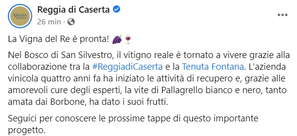 "La Vigna del Re è pronta!%u200B Nel Bosco di San Silvestro, il vitigno reale è tornato a vivere grazie alla collaborazione tra la #ReggiadiCaserta e la Tenuta Fontana. L'azienda vinicola quattro anni fa ha iniziato le attività di recupero e, grazie alle amorevoli cure degli esperti, la vite di Pallagrello bianco e nero, tanto amata- si legge nella nota- dai Borbone, ha dato i suoi frutti. Seguici per conoscere le prossime tappe di questo importante progetto."