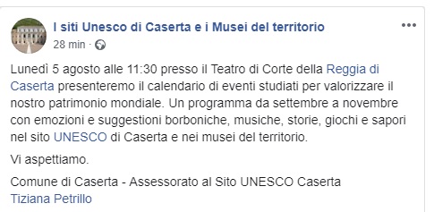 Questo il post pubblicato sulla pagina fb 'I siti Unesco di Caserta e i Musei del territorio"