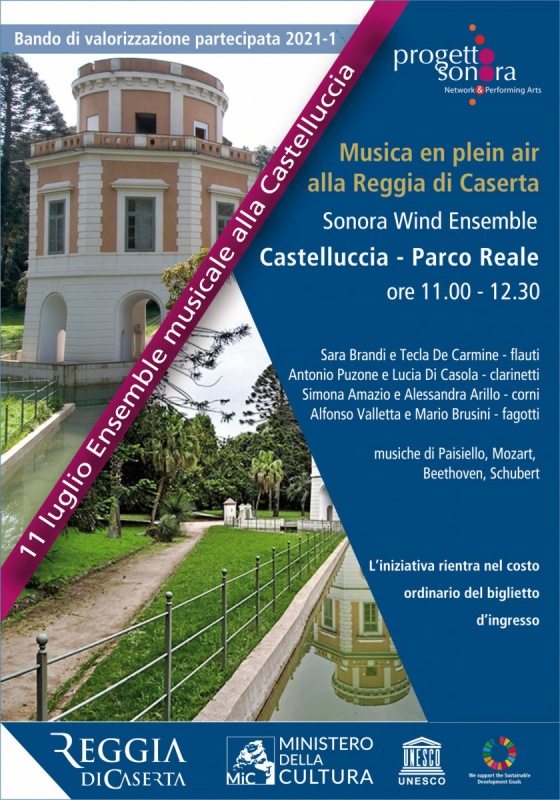 %u200BLe atmosfere della corte borbonica riprendono vita alla Reggia di Caserta con la musica en plein air nel Parco Reale. Domenica dalle 11 alle 12.30, negli spazi all'esterno della Castelluccia, le note del Sonora Wind Ensemble riecheggeranno nel Bosco Vecchio. Sara Brandi e Tecla De Carmine ai flauti; Antonio Puzone e Lucia Di Casola ai clarinetti - si legge nella nota -; Simona Amazio e Alessandra Arillo ai corni; Alfonso Valletta e Mario Brusini ai fagotti proporranno al pubblico le musiche di Paisiello, Mozart, Beethoven e Schubert. Brani di raro ascolto, secondo repertori e prassi esecutive in uso tra il '700 e l'800, renderanno ancora più suggestiva l'esperienza di scoperta del Parco Reale, accompagnando i visitatori lungo il percorso del Bosco Vecchio. L'iniziativa, realizzata da Progetto Sonora, è stata selezionata nell’ambito del bando di valorizzazione partecipata 2021-I della Reggia di Caserta. Tutte le iniziative in programma - si legge nella nota - sono incluse nel costo ordinario del biglietto di ingresso alla Reggia di Caserta acquistabile su Ticketone".