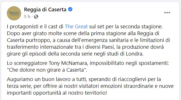 Questo quanto apprendiamo dalla pagina facebook della Reggia di Caserta: "I protagonisti e il cast di The Great sul set per la seconda stagione. Dopo aver girato molte scene della prima stagione alla Reggia di Caserta - si legge nella nota - purtroppo, a causa dell'emergenza sanitaria e le limitazioni di trasferimento internazionale tra i diversi Paesi, la produzione dovrà girare gli episodi della seconda serie negli studi di Londra. Lo sceneggiatore Tony McNamara, impossibilitato negli spostamenti: "Che dolore non girare a Caserta". Auguriamo un buon lavoro a tutti, sperando di riaccogliervi per la terza serie - si legge nella nota -, per offrire ai nostri visitatori emozioni straordinarie e nuove importanti opportunità al nostro territorio!"