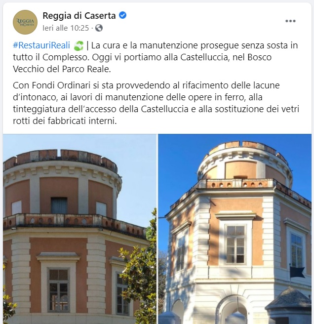 Questo quanto pubblicato sulla pagina fb della Reggia di Caserta: "La cura e la manutenzione prosegue senza sosta in tutto il Complesso. Oggi - si legge nella nota - vi portiamo alla Castelluccia, nel Bosco Vecchio del Parco Reale. Con Fondi Ordinari si sta provvedendo al rifacimento delle lacune d’intonaco, ai lavori di manutenzione delle opere in ferro, alla tinteggiatura dell’accesso della Castelluccia - si legge nella nota - e alla sostituzione dei vetri rotti dei fabbricati interni.