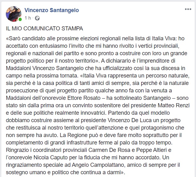 Questo quanto pubblicato dal candidato alle Regionali Vincenzo Santangelo
