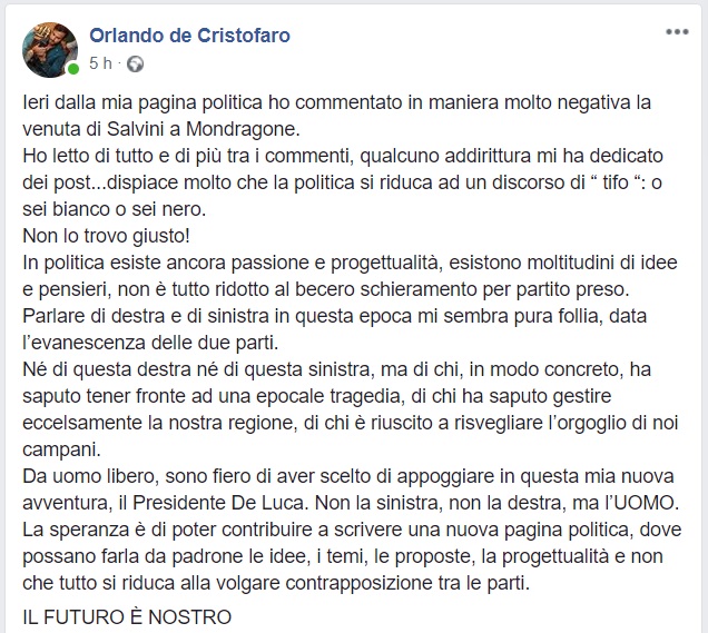 Questo quanto comunicato dal candidato alle Regionali 2020 Orlando De Cristofaro