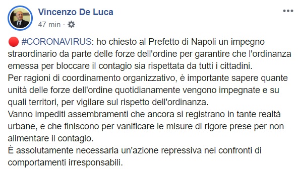 Questo quanto pubblicato sulla pagina facebook del Pres. De Luca: