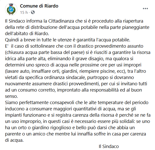 Questo il post pubblicato sulla pagina Facebook del Comune di Riardo: "Il Sindaco informa la Cittadinanza che si è proceduto alla riapertura della rete di distribuzione dell'acqua potabile nella parte pianeggiante dell'abitato di Riardo.Quindi a breve in tutte le utenze è garantita l'acqua potabile. E' il caso di sottolineare - si legge nel post - che con il drastico provvedimento assunto (chiusura acqua parte bassa del paese) si è riusciti a garantire la risorsa idrica alla parte alta, eliminando il grave disagio, ma qualora si determini uno spreco di acqua nelle prossime ore per usi impropri (lavare auto, innaffiare orti, giardini, riempiere piscine, ecc), tra l'altro vietati da specifica ordinanza sindacale, purtroppo si dovranno nuovamente assumere drastici provvedimenti, per cui si invitano tutti ad un consumo corretto, improntato alla responsabilità ed al buon senso. Siamo perfettamente consapevoli che - recita il post - le alte temperature del periodo inducono a consumare maggiori quantitativi di acqua, ma se gli impianti funzionano e si registra carenza della risorsa è perché se ne fa un uso improprio, in questi casi è necessario essere più solidali: se uno ha un orto o giardino rigoglioso e bello può darsi che abbia un parente o un amico che mentre lui innaffia soffre in casa per carenza di acqua - conclude".