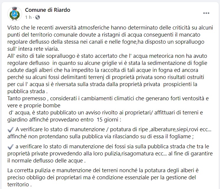 Questo quanto pubblicato sulla pagina fb del Comune di Riardo