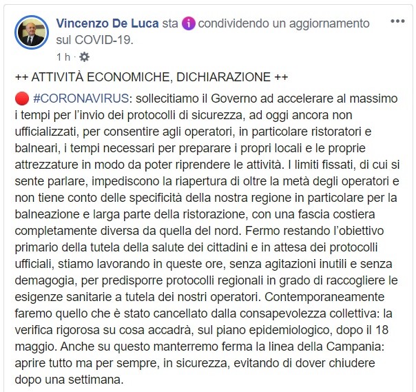 Questo quanto comunicato dal Presidente De Luca