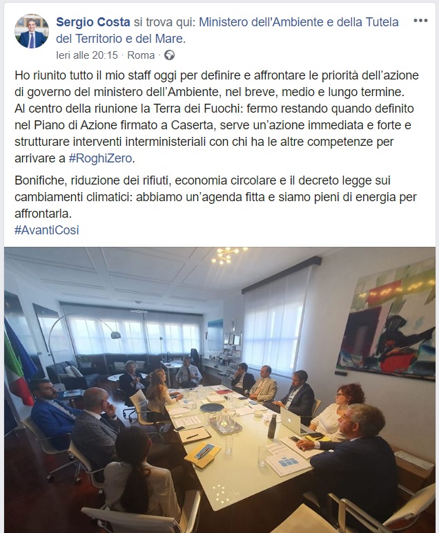 Questo quanto pubblicato dal Ministro Sergio Costa sul proprio profilo FB