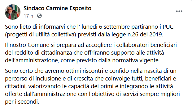 Questo il post pubblicato sulla pagina Facebook del sindaco di Sant'Anastasia, Carmine Esposito: "Sono lieto di informarvi che lunedì 6 settembre partiranno i PUC (progetti di utilità collettiva) previsti dalla legge n.26 del 2019. Il nostro Comune - recita il post - si prepara ad accogliere i collaboratori beneficiari del reddito di cittadinanza che offriranno supporto alle attività dell’amministrazione, come previsto dalla normativa vigente. Sono certo - prosegue - che avremo ottimi riscontri e confido nella nascita di un percorso di inclusione e di crescita che coinvolge tutti, beneficiari e cittadini, valorizzando le capacità dei primi e integrando le attività offerte dall’amministrazione con l’obiettivo di servizi sempre migliori per i secondi".