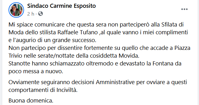 Questo il post pubblicato dal sindaco di Sant'Anastasia Carmine Esposito sulla sua pagina Facebook: "Mi spiace comunicare che questa sera non parteciperò alla Sfilata di Moda dello stilista Raffaele Tufano ,al quale vanno i miei complimenti e l’augurio di un grande successo. Non partecipo - comunica attraverso il post - per dissentire fortemente su quello che accade a Piazza Trivio nelle serate/nottate della cosiddetta Movida. Stanotte hanno schiamazzato oltremodo e devastato la Fontana da poco messa a nuovo. Ovviamente seguiranno decisioni Amministrative per ovviare a questi comportamenti di Inciviltà. Buona domenica - conclude".