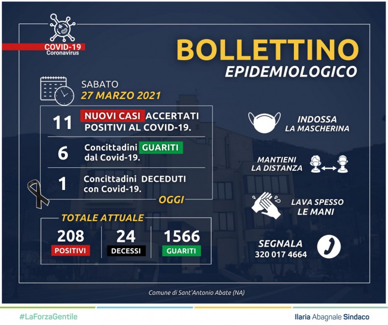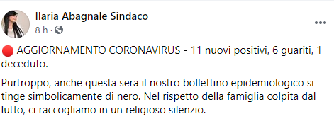 Questo il post pubblicato dal Sindco di Sant'Antonio Abate Ilaria Abagnale sulla sua pagina Facebook: "Aggiornamento Coronavirus: - 11 nuovi positivi, 6 guariti, 1 deceduto. Purtroppo, anche questa sera - scrive il Sindaco - il nostro bollettino epidemiologico si tinge simbolicamente di nero. Nel rispetto della famiglia colpita dal lutto, ci raccogliamo in un religioso silenzio".