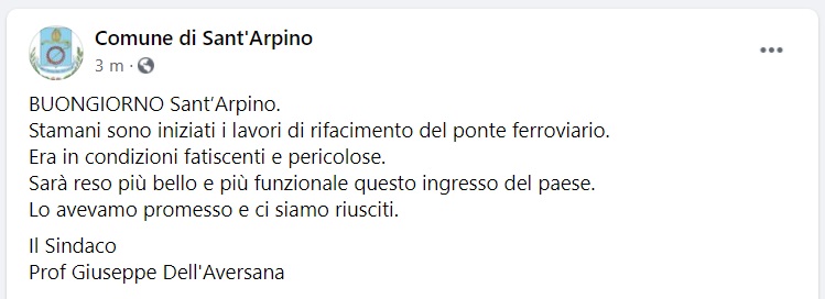 Questo quanto apprendiamo dalla pagina fb del Comune di S.Arpino: "BUONGIORNO Sant’Arpino. Stamani sono iniziati i lavori di rifacimento del ponte ferroviario. Era in condizioni fatiscenti e pericolose. Sarà reso più bello - si legge nella nota - e più funzionale questo ingresso del paese. Lo avevamo promesso e ci siamo riusciti. Il Sindaco Prof Giuseppe Dell'Aversana"