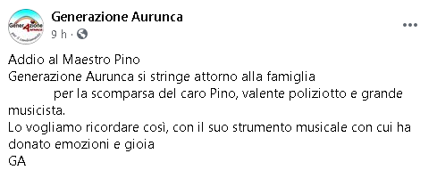 "Addio al Maestro Pino ...Generazione Aurunca si stringe attorno alla famiglia ...per la scomparsa del caro Pino, valente poliziotto e grande musicista. Lo vogliamo ricordare così, con il suo strumento musicale con cui ha donato emozioni e gioia ..."