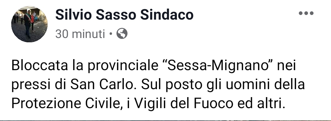 "Bloccata la provinciale “Sessa-Mignano” nei pressi di San Carlo. Sul posto gli uomini della Protezione Civile, i Vigili del Fuoco ed altri."