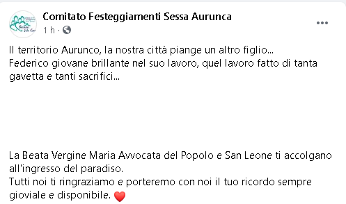 "Il territorio Aurunco, la nostra città piange un altro figlio... Federico giovane brillante nel suo lavoro, quel lavoro fatto di tanta gavetta e tanti sacrifici...La Beata Vergine Maria Avvocata del Popolo e San Leone ti accolgano all'ingresso del paradiso. Tutti noi ti ringraziamo e porteremo con noi il tuo ricordo sempre gioviale e disponibile".
