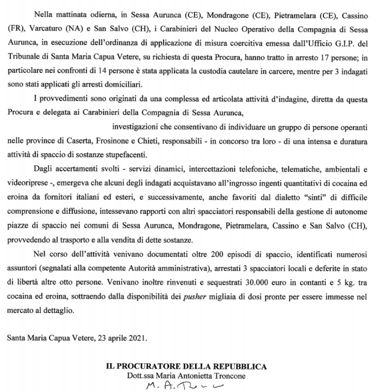 Pubblichiamo nota stampa Procura di SMCV