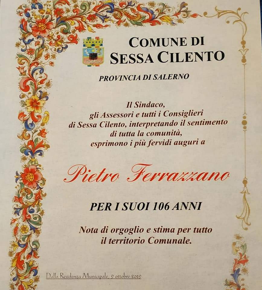 "PIETRO FERRAZZANO nato a Sessa Cilento il 09/10/1913, oggi compie la veneranda età di 106 anni, tutta la comunità di Sessa Cilento esprime i migliori auguri a lui e alla famiglia che lo circonda. Un uomo che ha sempre lavorato nel suo territorio natio e che ha contribuito alla crescita economico-sociale. Un milione di auguri sinceri ed affettuosi a Zio Pietro e alla famiglia tutta."