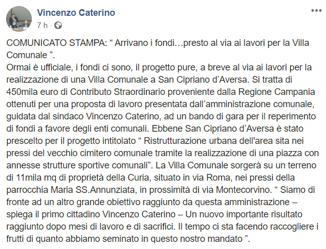Questo quanto pubblicato sulla pagina facebook del Sindaco Caterino: