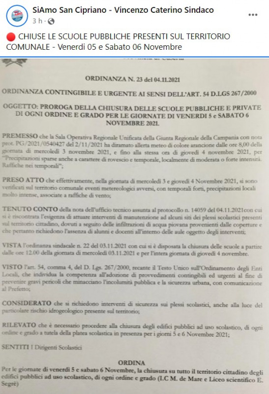 Questo quanto apprendiamo dalla pagina facebook 'SiAmo San Cipriano':