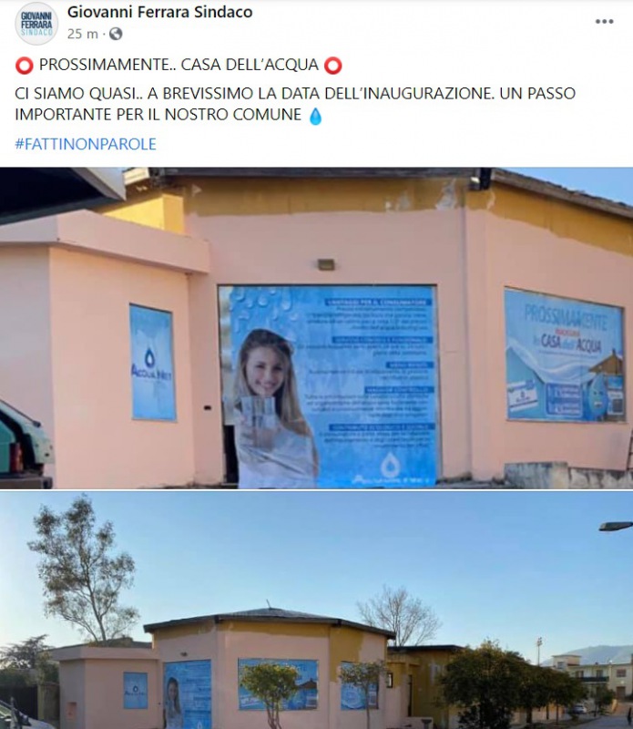 "PROSSIMAMENTE.. CASA DELL’ACQUA. CI SIAMO QUASI.. A BREVISSIMO LA DATA DELL’INAUGURAZIONE. UN PASSO IMPORTANTE PER IL NOSTRO COMUNE"