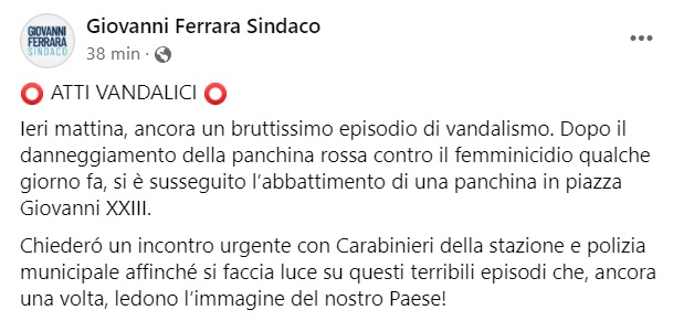 "Ieri mattina, ancora un bruttissimo episodio di vandalismo. Dopo il danneggiamento della panchina rossa contro il femminicidio qualche giorno fa, si è susseguito l’abbattimento di una panchina in piazza Giovanni XXIII. -Si legge nella nota- Chiederó un incontro urgente con Carabinieri della stazione e polizia municipale affinché si faccia luce su questi terribili episodi che, ancora una volta, ledono l’immagine del nostro Paese!"
