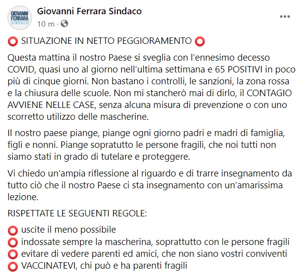 "Questa mattina il nostro Paese si sveglia con l’ennesimo decesso COVID, quasi uno al giorno nell’ultima settimana e 65 POSITIVI in poco più di cinque giorni. Non bastano i controlli, le sanzioni, la zona rossa e la chiusura delle scuole. -Si legge nella nota- Non mi stancherò mai di dirlo, il CONTAGIO AVVIENE NELLE CASE, senza alcuna misura di prevenzione o con uno scorretto utilizzo delle mascherine. Il nostro paese piange, piange ogni giorno padri e madri di famiglia, figli e nonni. Piange sopratutto le persone fragili, che noi tutti non siamo stati in grado di tutelare e proteggere. Vi chiedo un’ampia riflessione al riguardo e di trarre insegnamento da tutto ciò che il nostro Paese ci sta insegnamento con un’amarissima lezione. -Si legge nella nota- RISPETTATE LE SEGUENTI REGOLE: uscite il meno possibile indossate sempre la mascherina, soprattutto con le persone fragili evitare di vedere parenti ed amici, che non siano vostri conviventi VACCINATEVI, chi può e ha parenti fragili"