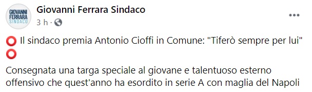 Questo quanto apprendiamo dalla pagina fb del Sindaco di S.Felice a Cancello: "Il sindaco premia Antonio Cioffi in Comune: "Tiferò sempre per lui" Consegnata una targa speciale al giovane e talentuoso esterno offensivo che quest'anno ha esordito in serie A con maglia del Napoli"
