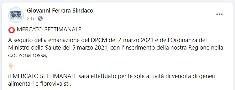 Questo quanto pubblicato sulla pagina facebook del Sindaco di S.Felice a Cancello: "MERCATO SETTIMANALE A seguito della emanazione del DPCM del 2 marzo 2021 e dell’Ordinanza del Ministro della Salute del 5 marzo 2021 - si legge nella nota -, con l'inserimento della nostra Regione nella c.d. zona rossa, il MERCATO SETTIMANALE sara effettuato per le sole attività di vendita di generi alimentari e florovivaisti."